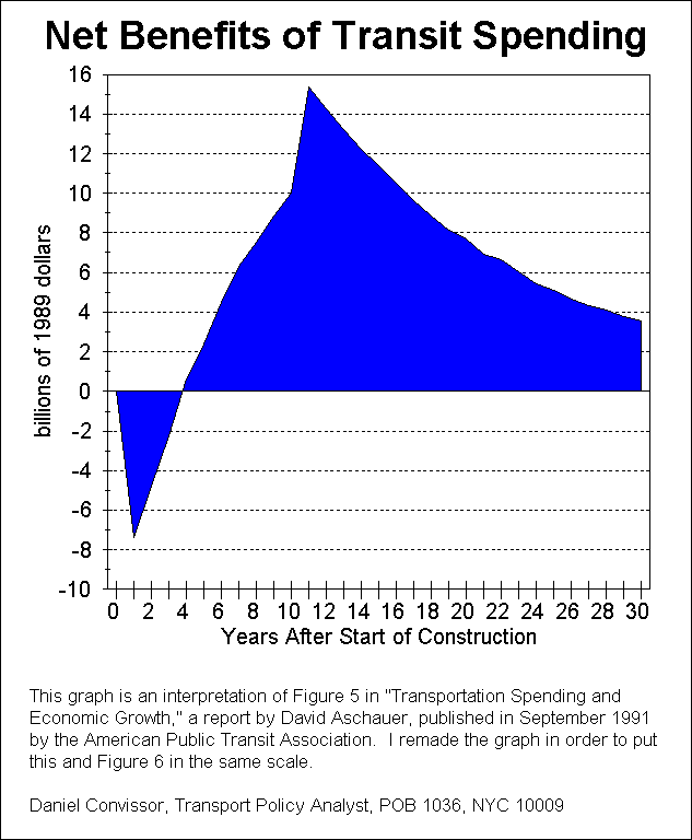 ![[GRAPH: Transit Spending: Negative net benefits bottom out at $7.5 billion in the first year of the program. Break Even point is four years into the program and peaks at $15 billion eleven years after the program started. (If you can't see this graph, but can download it, follow this link.)]](../graphics/bentst.gif)