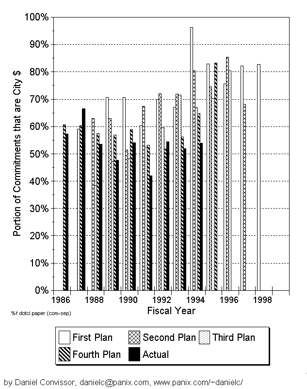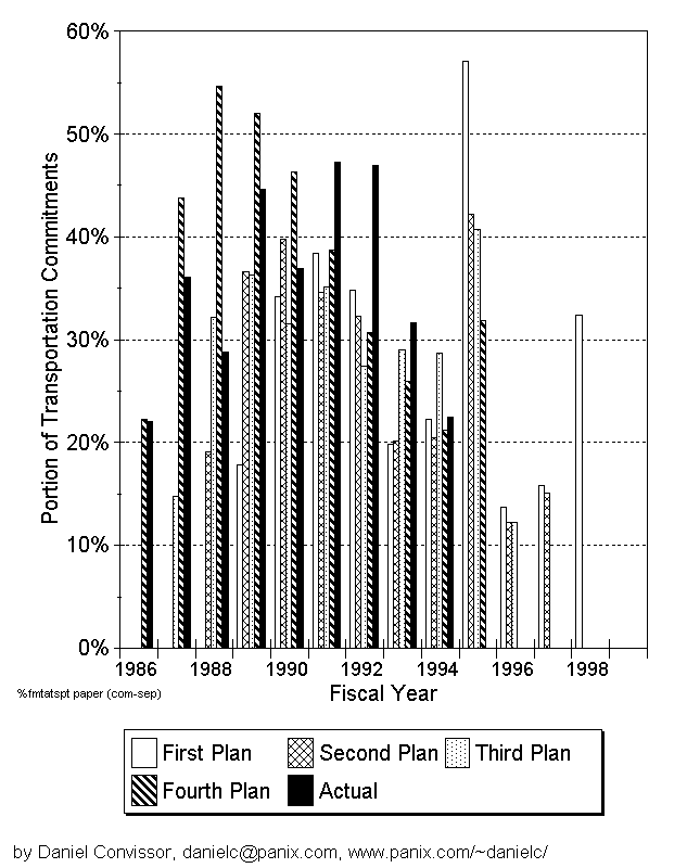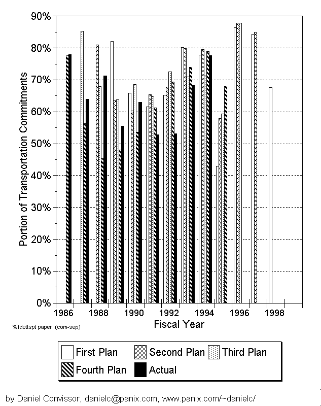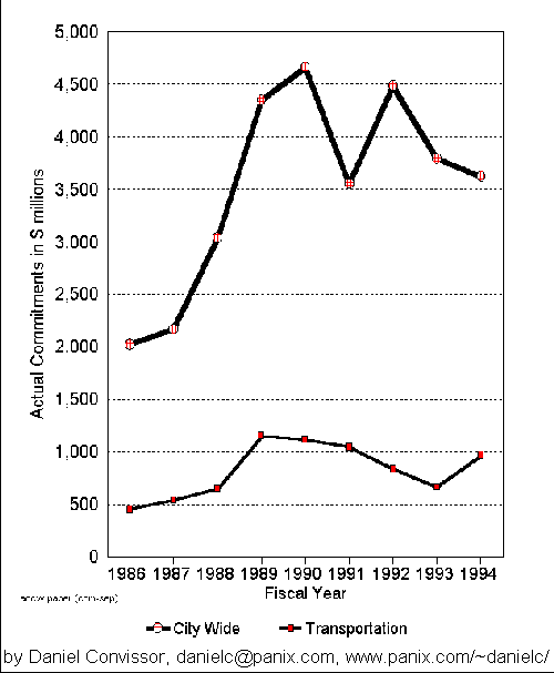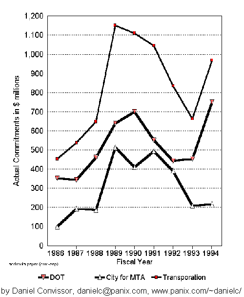 It is true that some of the DOT funds support transit related objectives. Ferries and Aviation along with Franchise Transportation account for about 5% of the DOT program. The East River bridges, which carry subway service, comprise 25% of the DOT's bridge commitments (Ten-Year Capital Strategy, May 1994). The subways are allocated 17% of the space on those bridges (6 lanes out of 30), thus they are using an estimated 3% of DOT's resources. Adding together the 5% for buses and 3% for bridges, transit gains $236 m., still leaving it in the dust at 28% of transportation spending.