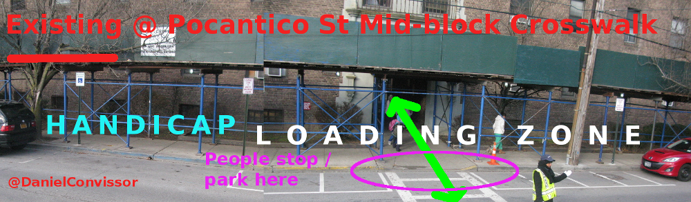 The loading straddles the crosswalk, leading to people parking cars in the crosswalk. There's a handicapped parking spot to the left of the loading zone.