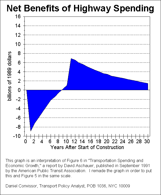 ![[GRAPH: Highway Spending: Debt bottoms out at -9 billion in the first year of the program. Break Even point is roughly nine years into the program. The benefits peak at $7 billion at twelve years after the program begins. (If you can't see this graph, but can download it, follow this link.)]](../graphics/benhwy.gif)
