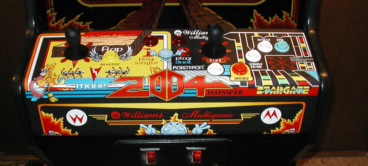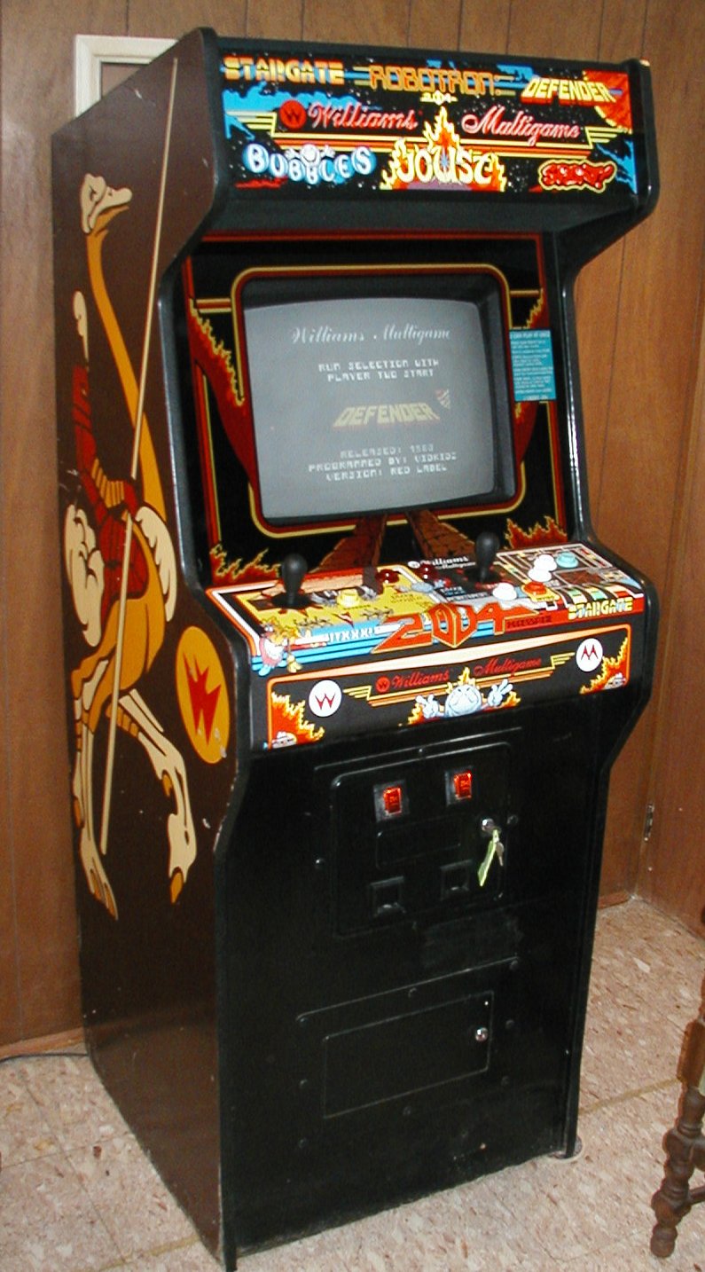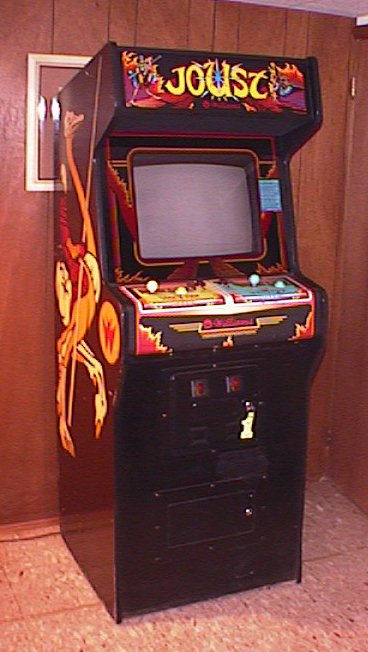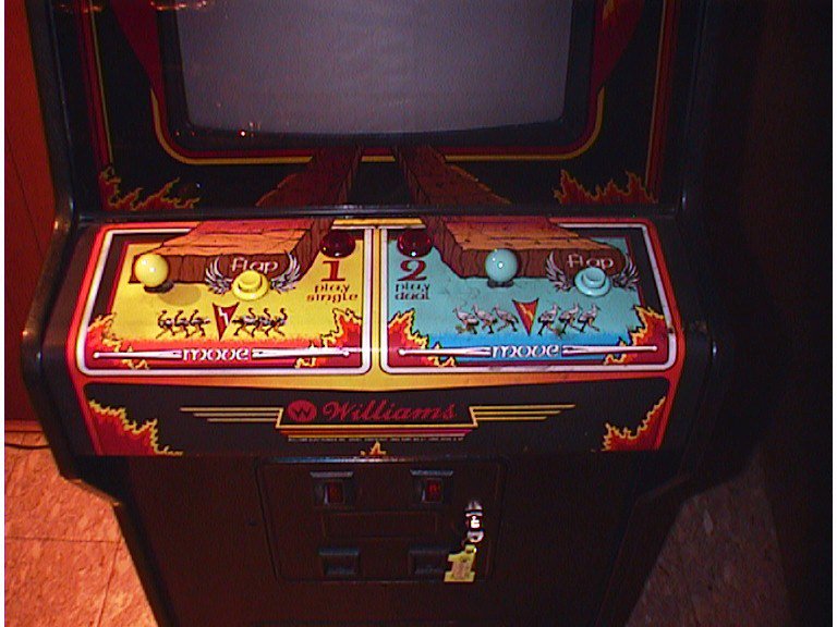 I used some fine grit sandpaper to smooth out the bumps on the control panel cause by cigarette burns, and used some compound to remove surface smears of odd paint on the side art. Maybe someday I'll sand down the sides and repaint her. But for now, I just enjoy playing her. Both my Joust and my Sinistar are receptacles for my *Quarters for Vega$" fund. When I go in April, I'll empty the bellies of these beasts and plunk the change down a one-armed bandit (progressive, of course) and go for broke. Wish me luck. I have ordered a Williams Multi-Game Kit from Clay. I have installed the kit, and it works flawlessly. I also ordered a Mutli-Williams Control Panel, Control Panel Overlay, and Marquee from Darin. I also ordred all the necessary controls from the Real Bob Roberts, and put the whole package together on a rainy day in March 2003. I can now play Defender, Stargate, Joust, Robotron, Bubbles, and Splat. Take a look at the photographs at the bottom of the page to see what my Joust looks like now. This game was photographed (along with yours truly) and appeared in the January 27th issue of Long Island Newsday (Life Section). The photo didn't make the on-line edition. This is a project in work, so please be forgiving if stuff you want is not here. I may provide scans of Drawings - it'll depend on legibility and file size in the future. The Joust LibraryClick on an image to see larger photos of my Joust. Before Multi-Willy