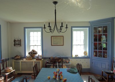The inner east wall of this kitchen (now keeping room) holds four doors side-by-side. The south door enters the south or dining room of the Georgian section, the next door enters the hallway, the third door opens into the cellar stairway of the Georgian basement, and the north door enters the parlor of the Georgian section. The north wall holds the same formation as the south - one outside door and one window. The porch that originally stood there was enclosed in the 1950s by the Bodys, and has been remade in 2004 into a 13.4' square modern kitchen. The old kitchen with fireplace facility may have stood unto itself or it may have serviced a more primitive house (possibly log) than the present Georgian four-room & hall house, but no records have been found to verify either possibility. |
