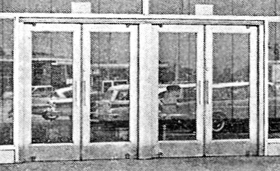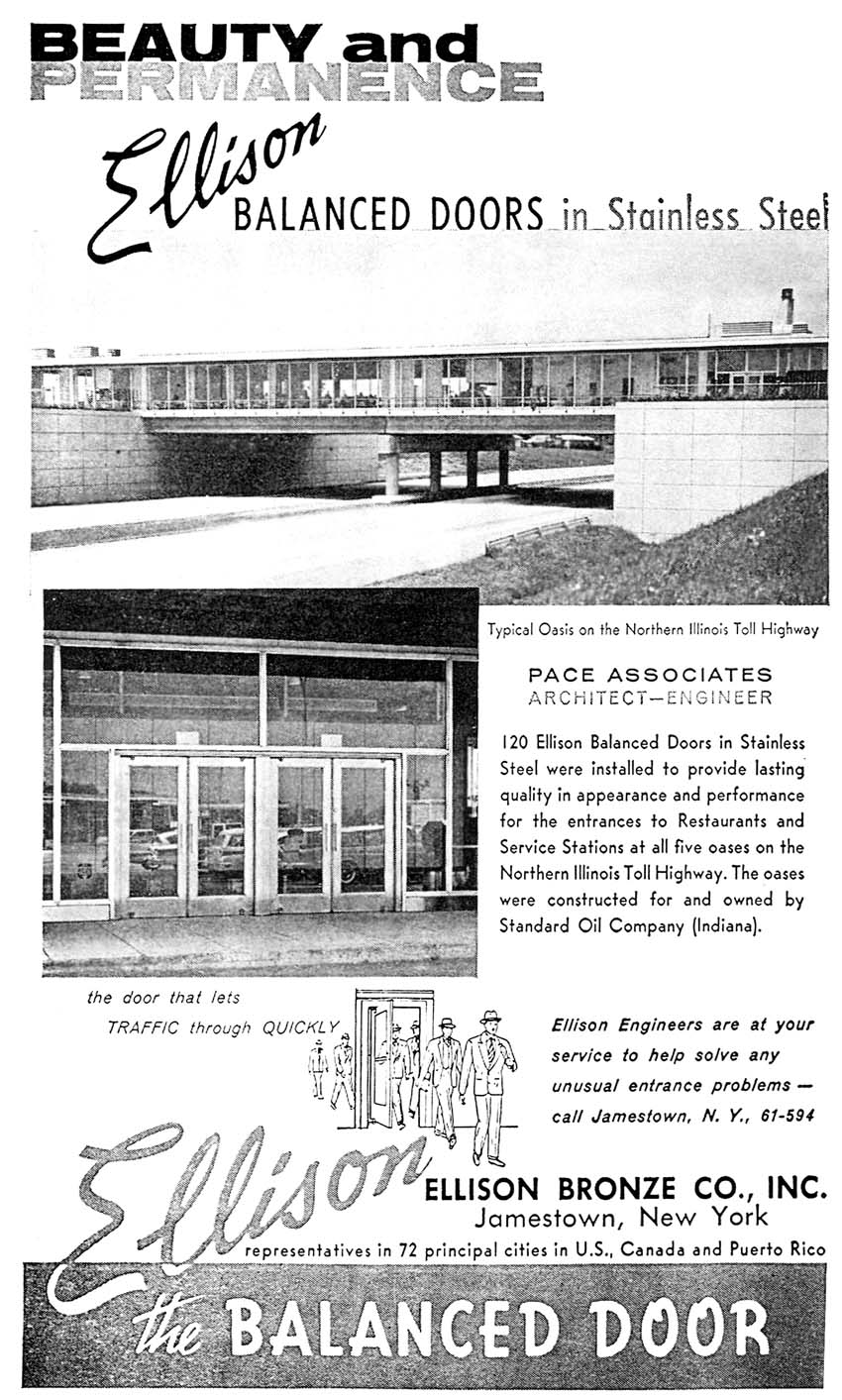 The five original Oases had heavy stainless steel entrance doors made by the Ellison Bronze Company. This photo is from an ad they placed in an architecure magazine at the time (see the entire ad here, thanks to Rich Kummerlowe for providing this scan). Note the 1950s cars reflected in the glass, and the gas station behind them to the left.