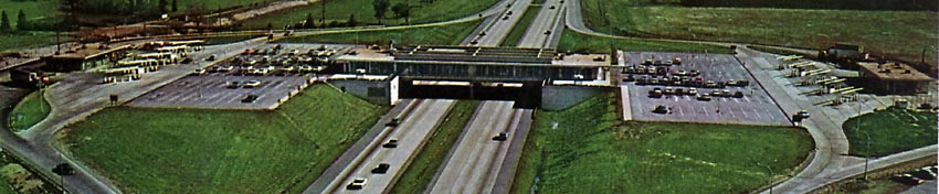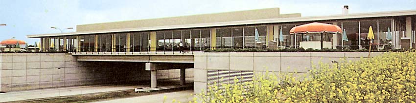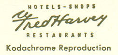 The restaruants were originally run by the Fred Harvey organization, but in 1975 they were taken over by Howard Johnson, who remodeled the interior and added their distinctive orange roofs. Click here to see some comments from a former Howard Johnson employee.