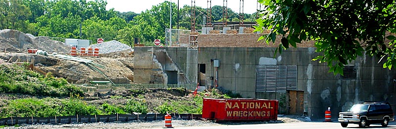 At Hinsdale, for some reason the ground was dug away from the basement walls. My guess is that this was done to correct a drainage problem in the parking lot. Again, you can see the footings for the new terrace area to the left.
