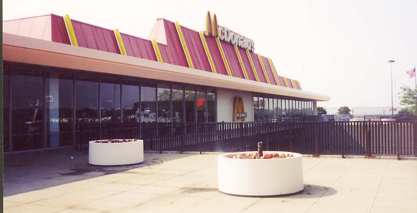 This is one of the McDonalds locations. Their small gift shop is behind the blocked-out windows in the center. The yellow stripes on the roof light up at night. Note the potted tree stump on the otherwise barren terrace.