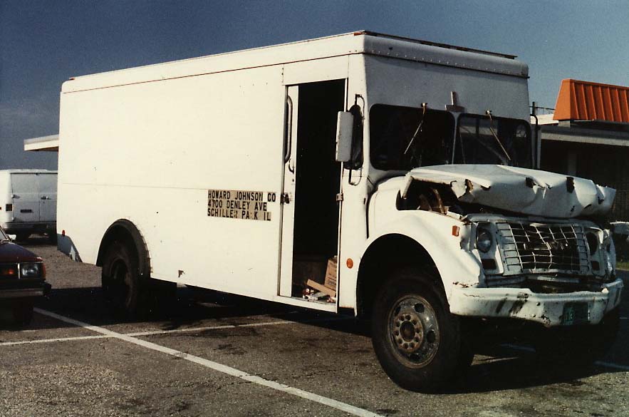 Howard Johnson's vending route truck, after it rear-ended a dump truck on the Tollway. The address on the side of the truck is the street address of the O'Hare Oasis, where the vending division was based (snapshot taken by a former employee).