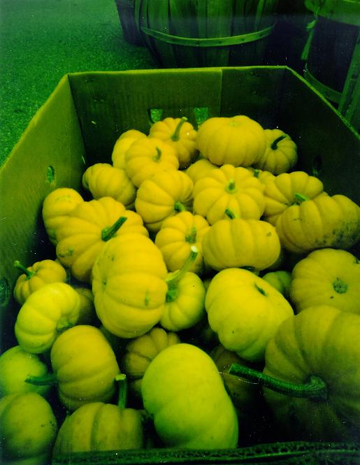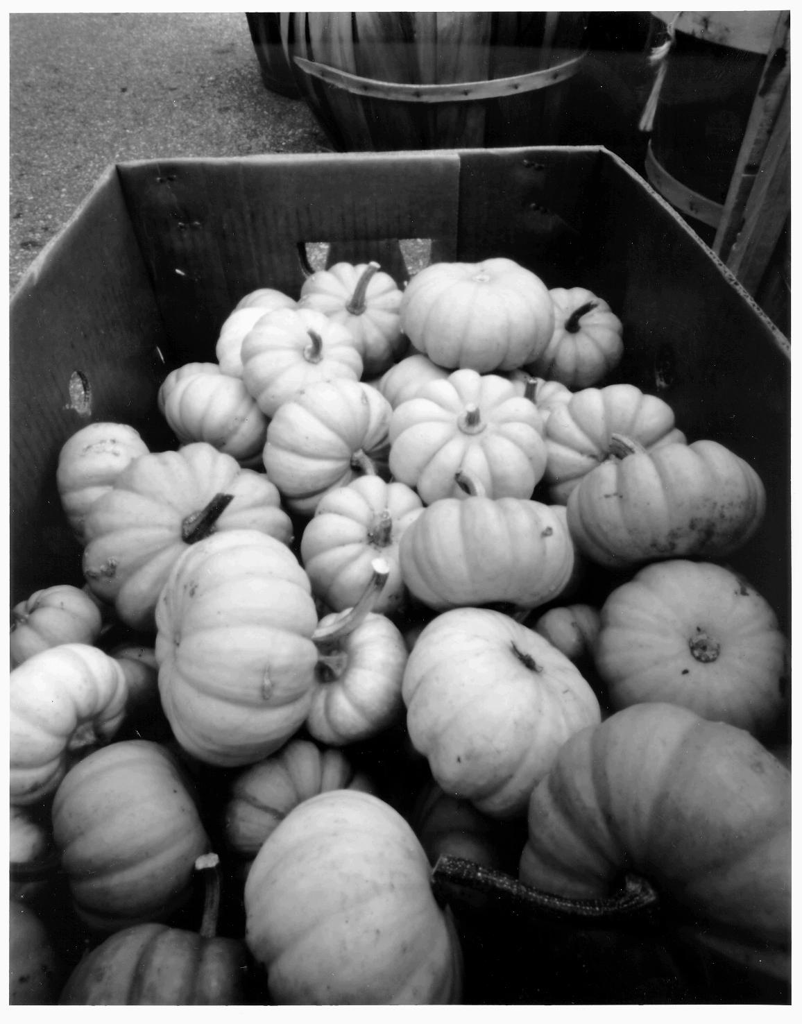 This was a box of gourds being sold for Halloween decorations. The pinhole camera was setup right at the front of the box pointing towards the back. The black and white image was taken with Kodak TMAX 100 film in Readyload form and this is a scan of a 8x10 print. The color image was taken with Type 79 (now Polacolor Pro 100) film.