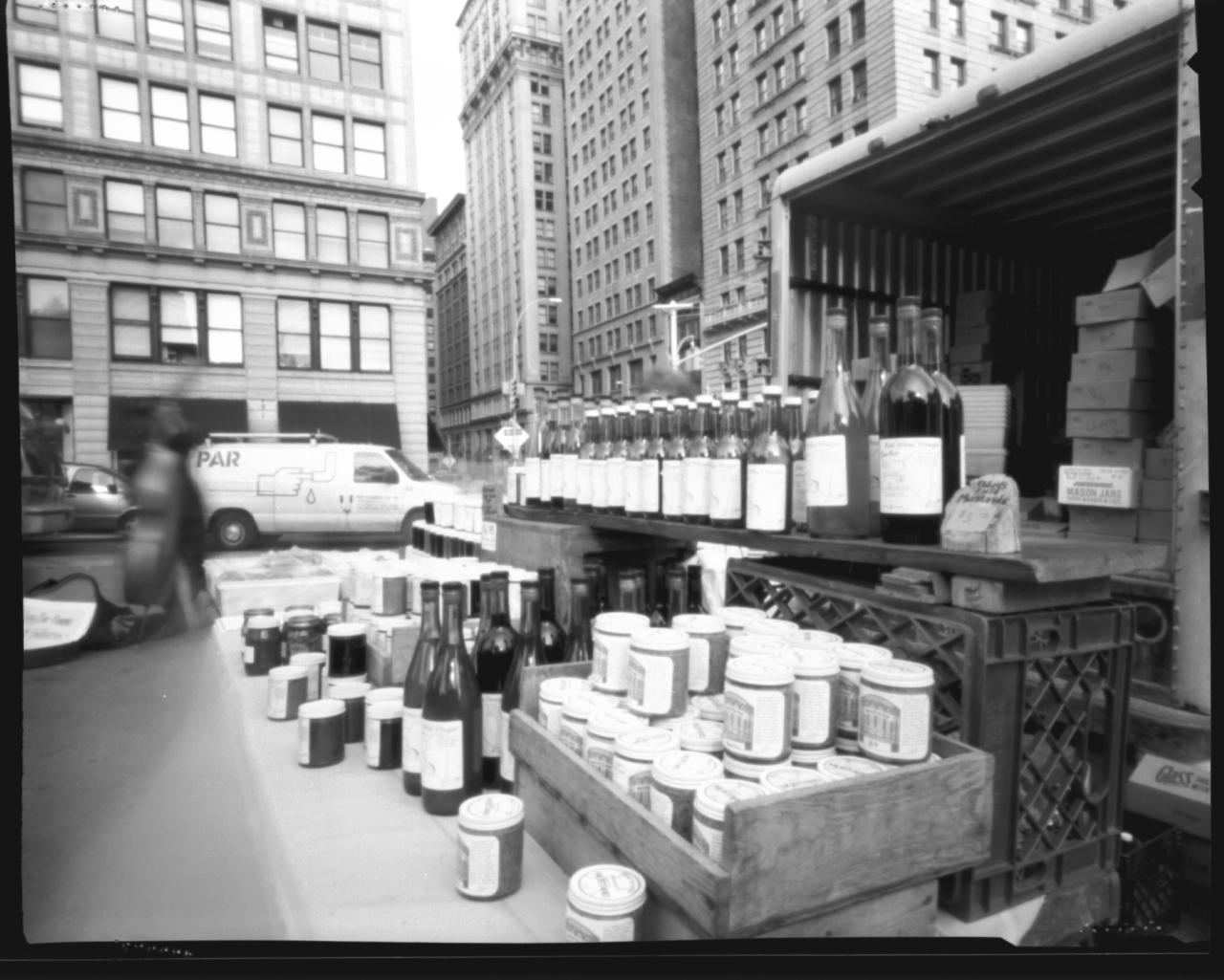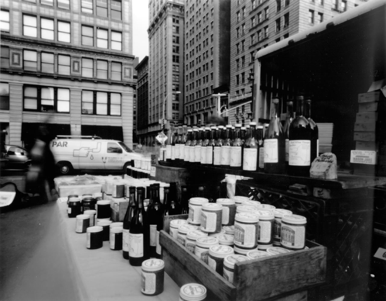 This was a wine and preserves merchant at the northeast corner of the Greenmarket. The gourds pictured above were in the stand right next to this one, and about where the tripod is set up to take this shot.
