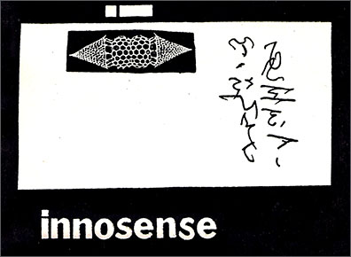 Premiered at Studio PASS in NYC, 1981. Innosense is a post-apocalypse opera set in a basement in the Lower East Side. The three "live" characters are the "Three Improvisers", here performed by Charles K. Noyes on percussion, Lesli Dalaba on trumpet, and Sharp on fretless electric guitar, soprano sax, and bass clarinet. The characters Bio/logicals, The State, and Myth are all prerecorded and played back from stereo cassettes, one for each of the performers. Materials for these characters includes vocal and instrumental sounds made by Sharp, found sounds, sound effects, and texts both written by Sharp and appropriated from various sources. Voices for these characters include Victoria Vecna and Felipe Orrego. The Geoclock is a prerecorded percussion track performed by Sharp and plays back continuously. Recorded November 1981, zOaR Music.