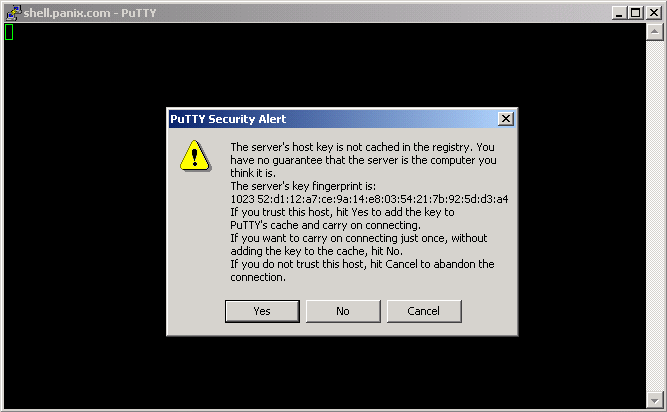 All Panix host machines have a unique key fingerprint that can be checked upon the initial connection, to make sure the machine you're connecting to is in fact the real machine, and not a stolen session. Panix keeps a copy of all our shell machines' fingerprints for comparison here: Panix Public Key page This is a one-time occurence. Once you tell PuTTY that the machine is valid, it will remember for future connections.