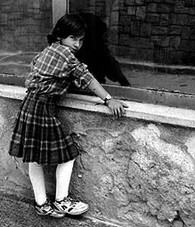 Young girl watching swimmers in a pool in Sinaia