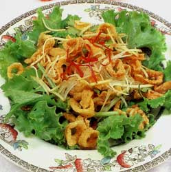 Slice squid cross-wide (into rings). Wash with water and air dry. Add oil in frying pan and heat. Add squid and fry a little until the squid is golden and crisp. Remove from oil. Dissolve lime juice, nam pla, and palm sugar. Add sufficient ground, broken prik ki nu to taste. Add crispy fried squid in a bowl with roasted peanuts. Add the lime juice mixture. Place lettuce in bowl, add the salad mixture and juices, and garnish with chile and red chiles. Serve immediately.