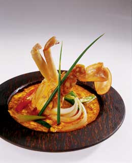 ![]() | This is a mild curried dish, usually served as a counterpoint to a more intense curry or garlic dish. It can be prepared with crab claws, or with a cup of crab meat, or a mixture of crab meat and shrimp. Since it is often eaten with chop sticks, you might consider removing the meat from the claws, as this makes it easier for the spice flavours to penetrate and easier to eat the food. Thai curry powder (phom kari) is unlikely to be available outside Thailand. Use a mild Indian curry powder instead. Prik yuak is a sweet green chili, if not available use green bell peppers or canned jalapeños to taste. |