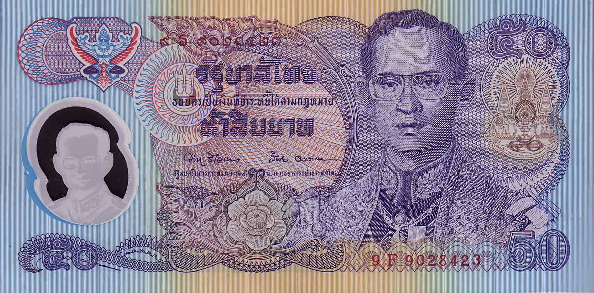 ![]() | P90 / R33 - 50 Baht Issued: 20 September 1985 Serial Number: 7 J 7046464 Front: HM King Rama IX in uniform of the Supreme Commander of the Armed Forces with a ceremonial robe at right, Garuda at upper left (aligned perfectly with the Garuda on the back), translucent security thread with micro-printing (the word "Thailand" at intervals) embedded in the paper, the rose design at bottom center is taken from a design on the window facade of the Rajapongsanusorn Hall at the Temple of the Emerald Buddha in Bangkok Back: Monument of King Rama VII with the Anantasamakom Throne Hall where King Rama VII granted a permanent constitution in the background, Privy Seal of King Rama VII at upper left Watermark: King Rama IX profile with a special translucent side piece of the King's glasses Signature: 62 (Note: Standard Catalog of® World Paper Money, Modern Issues, 1961-Present, 15th Edition indicates Signature 54-60, 63) Size: 144 x 72 mm | ||
