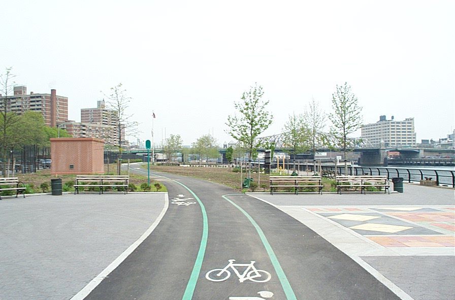 All fenced in with no place to go, this brand-new Greenway segment runs for four blocks along the Harlem River. You can enter it from Madison Ave and East 135th Street (go East on the 135th St sidewalk path on the north side of the highway ramp to the FDR drive).