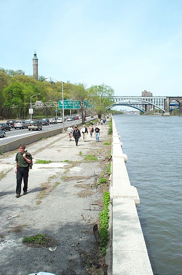 Hikers participating in the May 3, 2003 "Great Saunter" around the Manhattan waterfront. The Highbridge Tower watches over the area from the upper left.