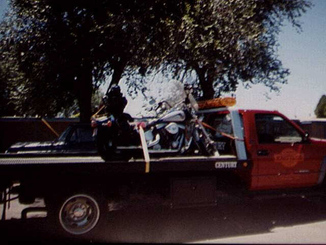 Figured I had 3 or 4 hours, so I took the time to write some postcards, do laundry, and then tried to get a hold of someone who I only knew from the internet. I beeped him a few times, and then left messages at his house. Also went to eat breakfast. Packed my stuff on the bike and checked out of the motel. But they let me hang out and wait for the tow truck. The tow truck arrived a little after 12 and we were on our way by 12:30pm.