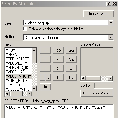 to select just the eucalyptus and pine patches that intersect roads, using