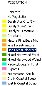 forest, yellow and orange for eucalyptus and pine since they are fire risks,