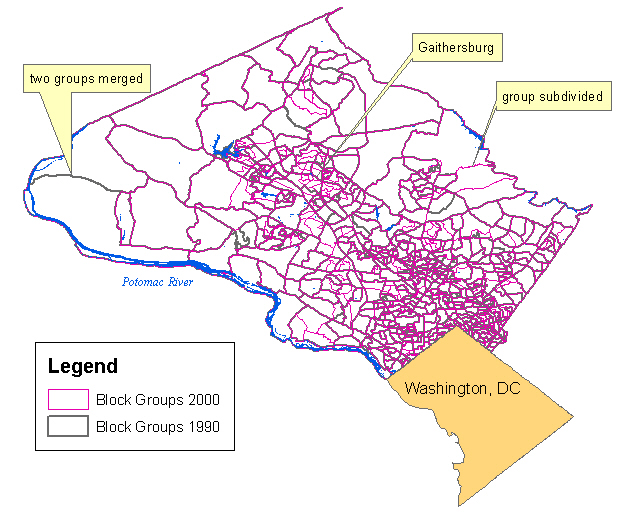 First, look at how the census block groups changed from 1990 to 2000. The census blocks are smallest close to the city of Washington, where population is densest. Where thicker gray lines appear by themselves, it indicates 1990 boundaries that were dissolved in 2000; where thin pink lines appear by themselves, it indicates new boundaries drawn in 2000. Many blocks were subdivided where population is growing, for example in the city of Gaithersburg in the center of the county. Some were merged where population is falling, for example in the farthest west of the county.