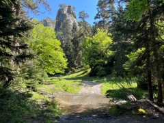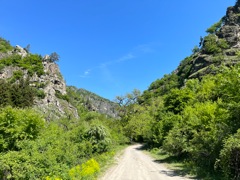 We went hiking today in the national park again. This time we took a 40 or so minute taxi ride to another entrance of the national park. Even though it wasn't that far from where we were yesterday, it was a totally different looking forest with different kinds of trees and plants. There were parts of the path that were flooded by small streams due to melting snow from the mountains deeper in the national park. We were the only people there again because we got there early and again when we were leaving we passed more people who were just arriving. It was supposed to rain today but we had a totally blue sky! The village where the trail started was extremely remote. There were no taxis nearby on the apps we've been using. We were standing at the same spot the taxi dropped us off deciding what to do to get back. A taxi came by driving some hikers to the national park and he nodded to us to indicate he would pick us up on the way back. However, we waited for about 10 minutes and he didn't return. Eventually we decided maybe the taxi driver himself had decided to go for a little hike and I convinced Buster we should investigate the sign next to the bench where we were waiting... |