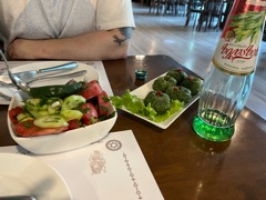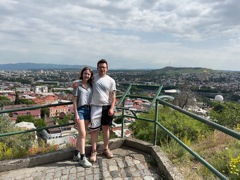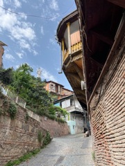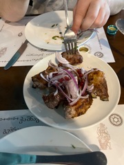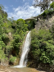 We hiked up to the botanical garden. The entrance is on top of the hill behind the fortress we went to yesterday. The main area of the garden is in the valley between the two hills we hiked up yesterday. On top of the hill is the Mother of Georgia statue, who holds a wine glass in one hand to welcome Georgia's friends and a sword in the other for Georgia's enemies. Another day full of hills and stairs! After the botanical garden we had a nice light lunch with a two classic Georgian vegetable dishes, a tomato and cucumber salad and a dip made of spinach and walnut. I had an electric green tarragon lemonade, which is a popular drink here. We also had barbecued pork. |