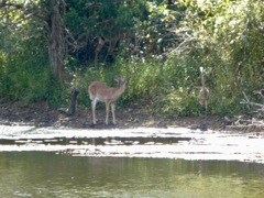two deer - a doe and a fawn - came along. They all stood there on the bank.